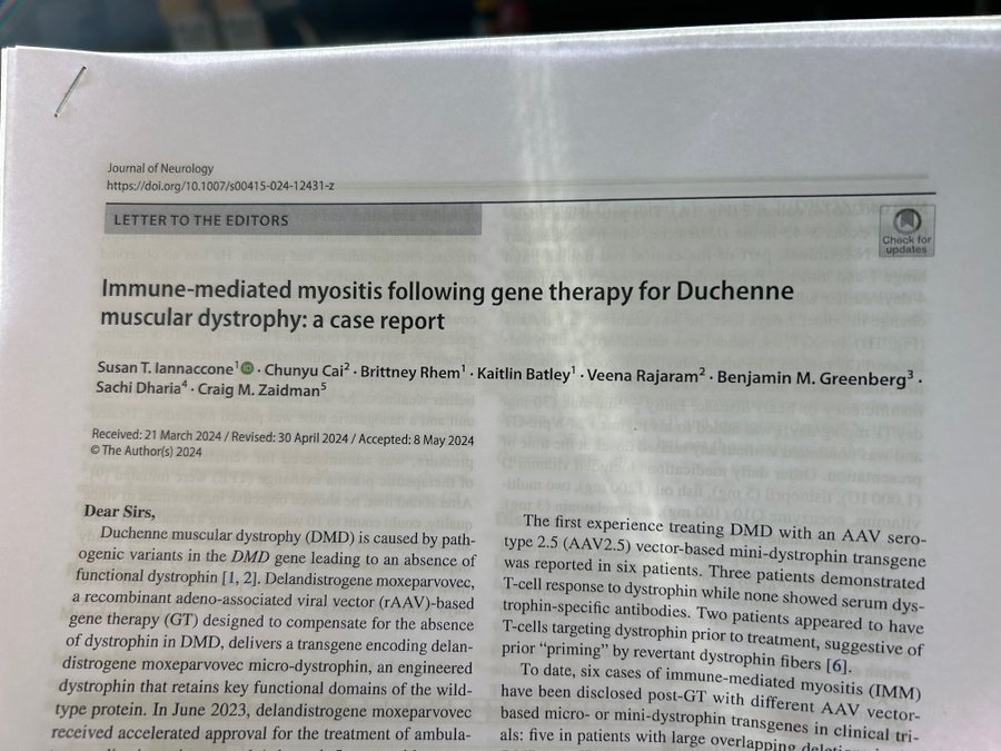Today’s pick from journal of neurology by Iannaccone et al: a case report of a Duchenne patient who had an auto-immune response to micro-dystrophin after elevidys treatment. DOI: 10.1007/s00415-024-12431-z